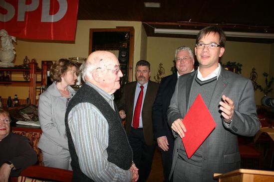 Bild: 05.12.2009 Das ist rekordverdächtig: Seit 80 Jahren ist Karl-Heinz Hoppe Mitglied der SPD. Florian Pronold ehrte den Jubilar und sprach ihm seinen Dank für die lange Treue zur SPD und die politische Arbeit aus.